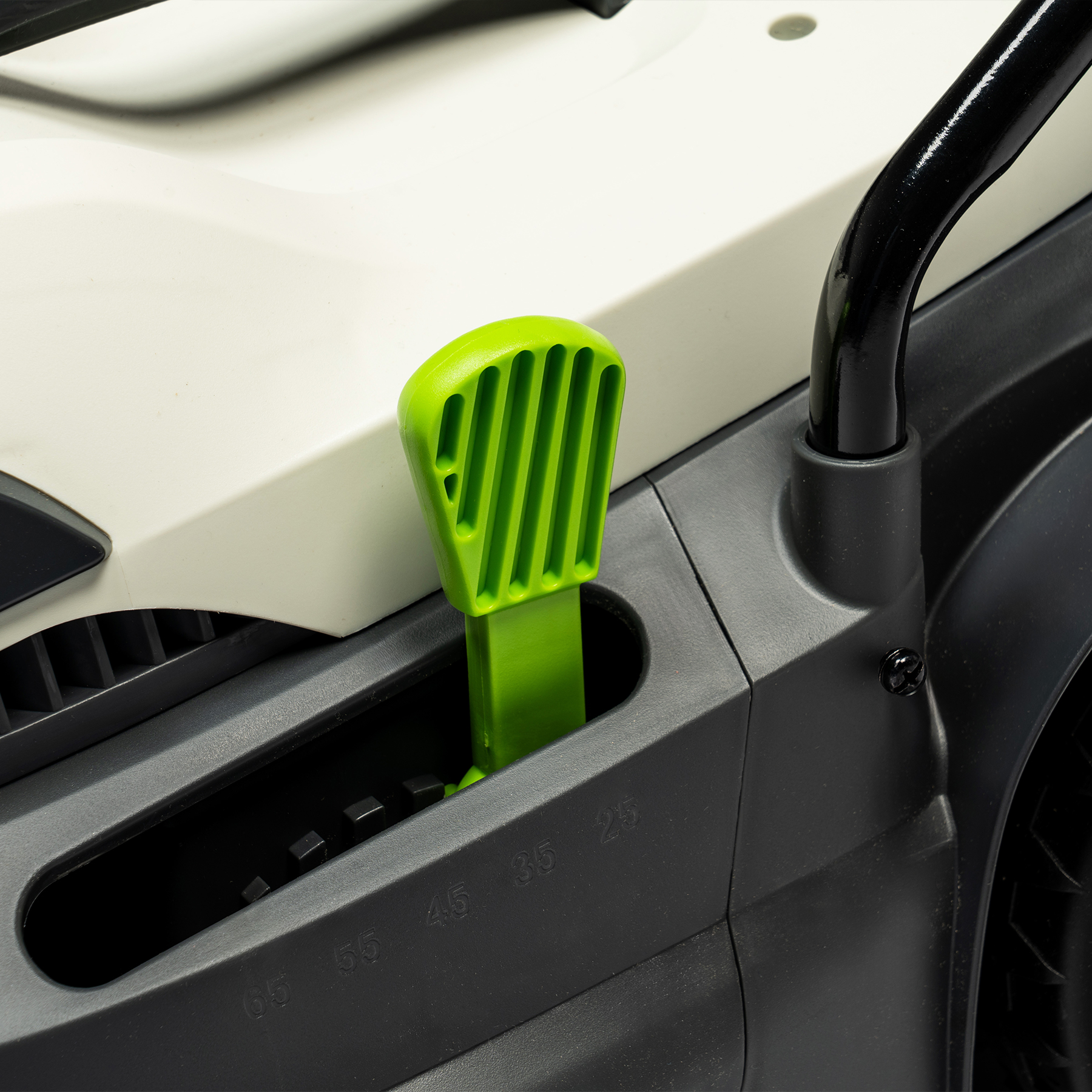 Centralna regulacja wysokości koszenia pozwala ustawić wysokość w 5 poziomach w zakresie od 25 do 65 mm.
