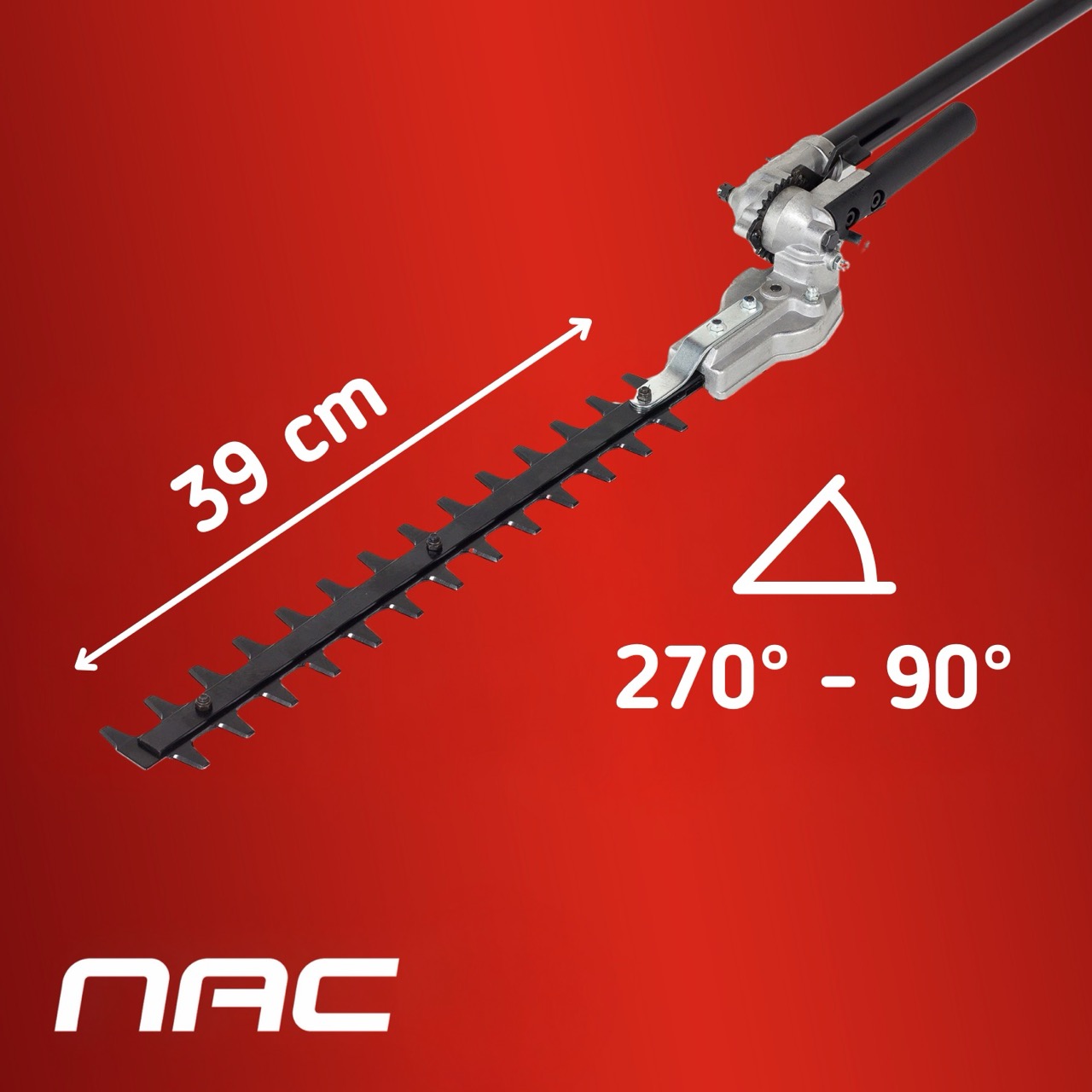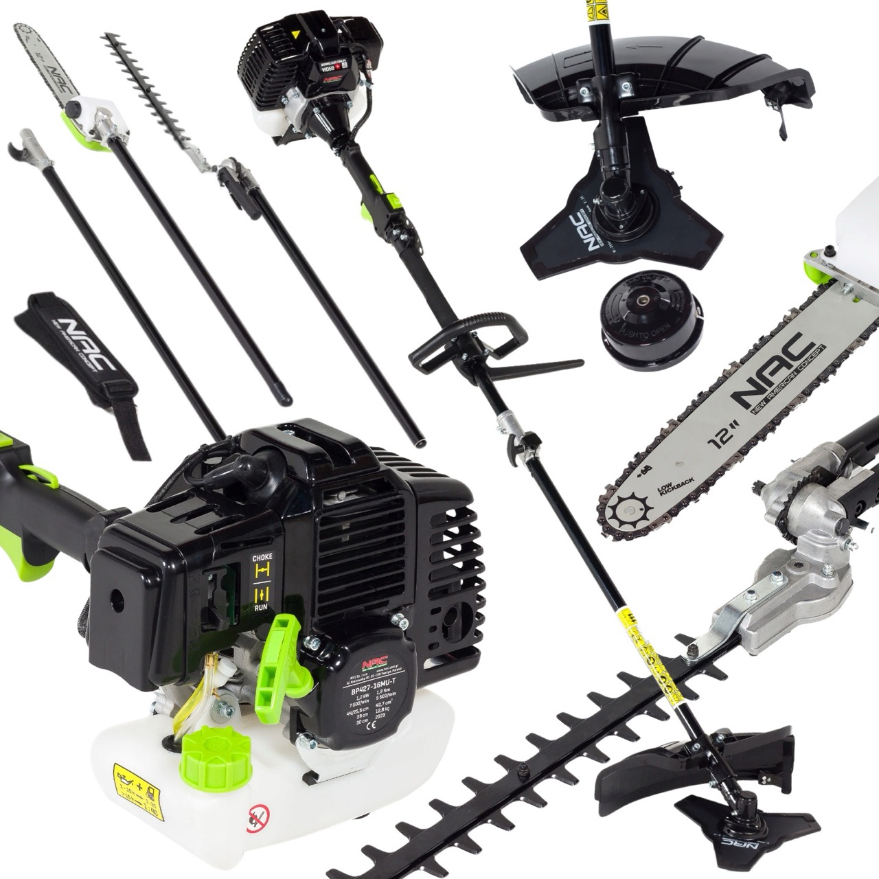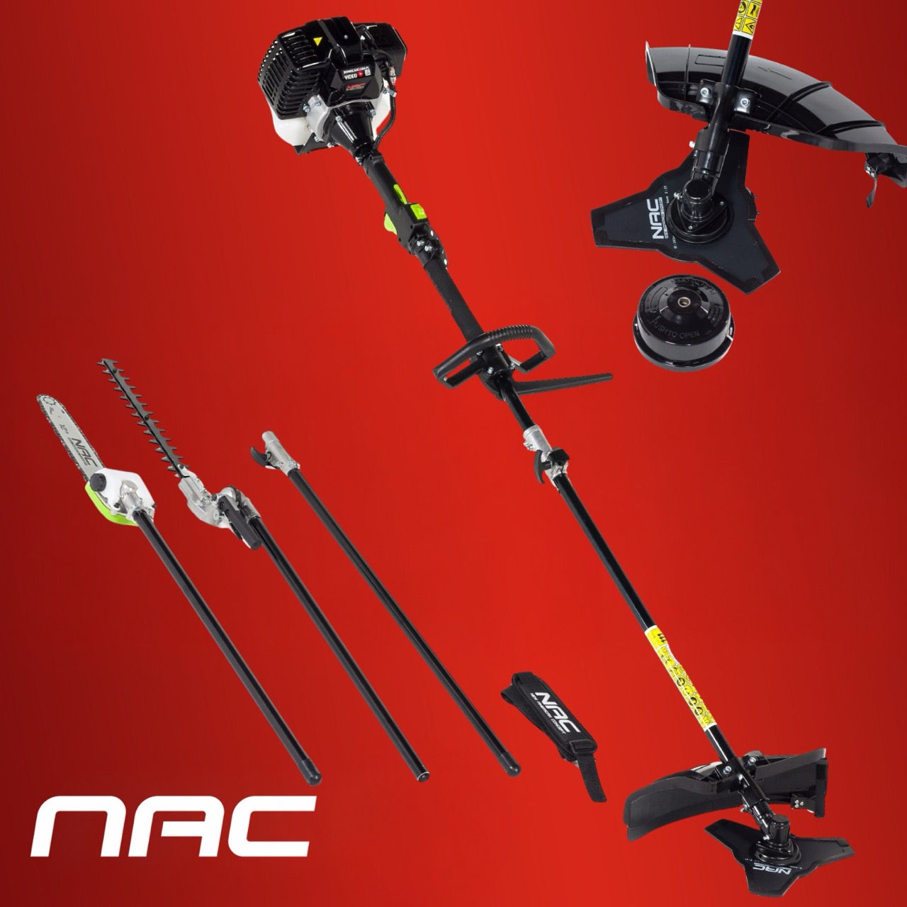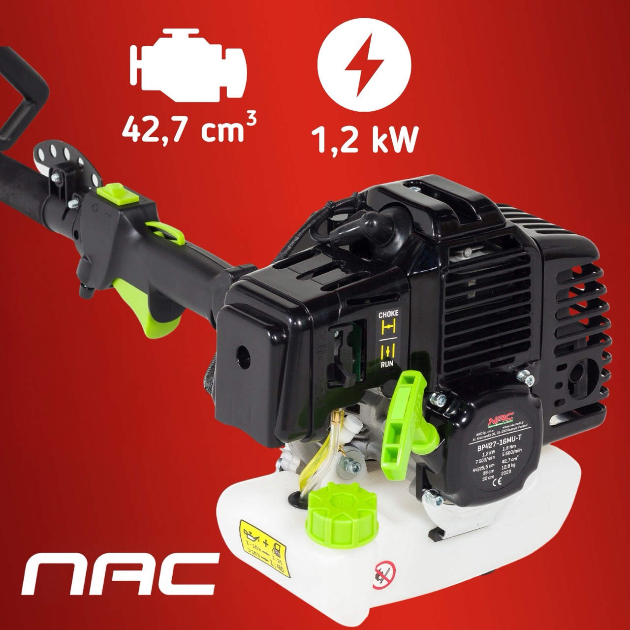 NAC BP427-16MU-T to urządzenie wielofunkcyjne, które łączy w sobie funkcje kosy spalinowej, nożyc do żywopłotu i pilarki łańcuchowej.