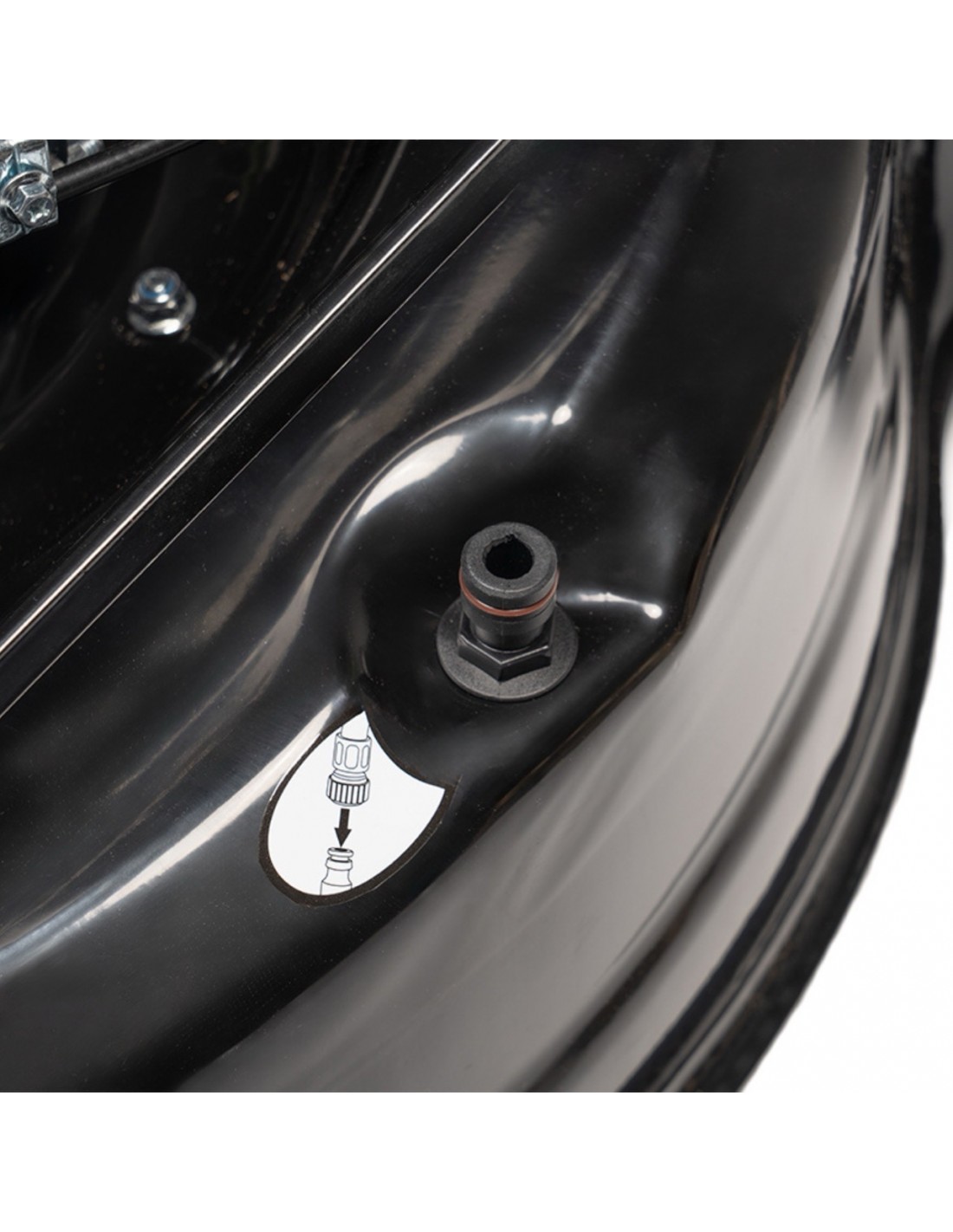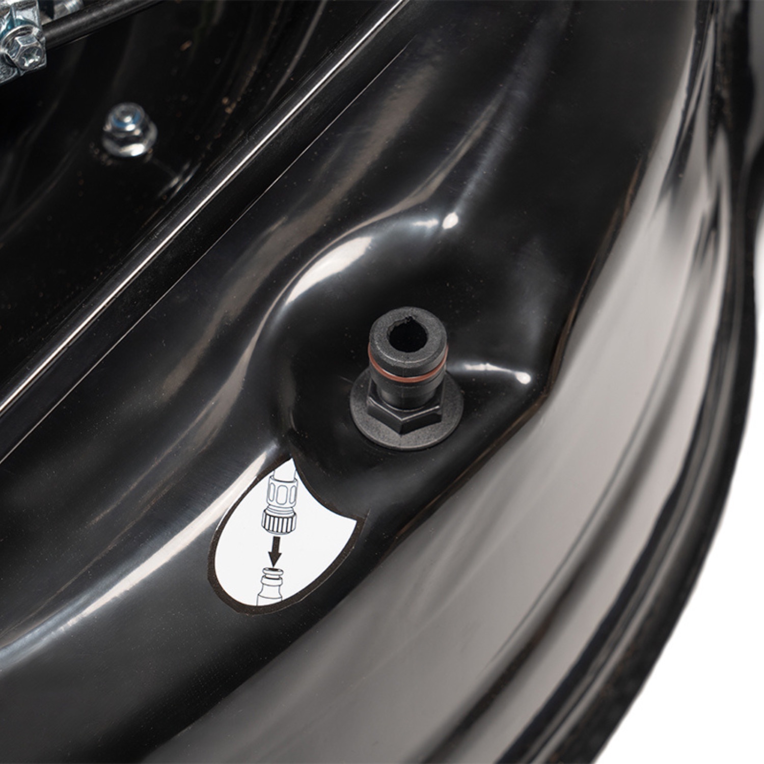 System mycia obudowy pozwala w prosty i szybki sposób umyć korpus kosiarki- wystarczy podłączyć wąż ogrodowy z wodą do króćca na obudowie oraz uruchomić kosiarkę.
