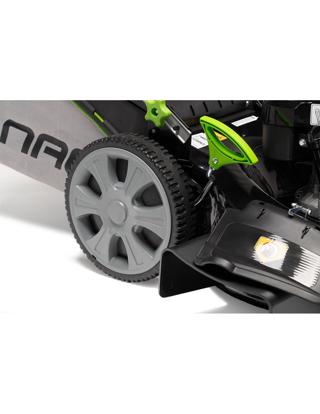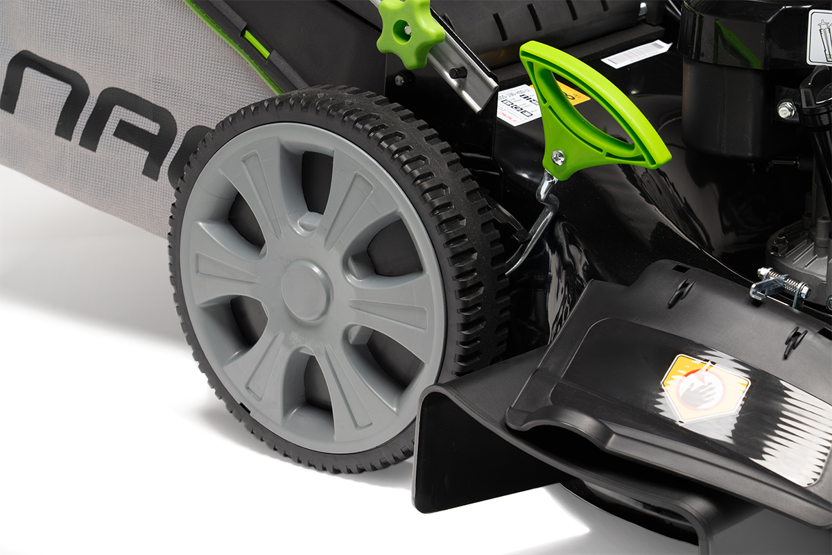 Duże łożyskowane koła zmniejszają opory toczenia i ułatwiają prowadzenie kosiarki.