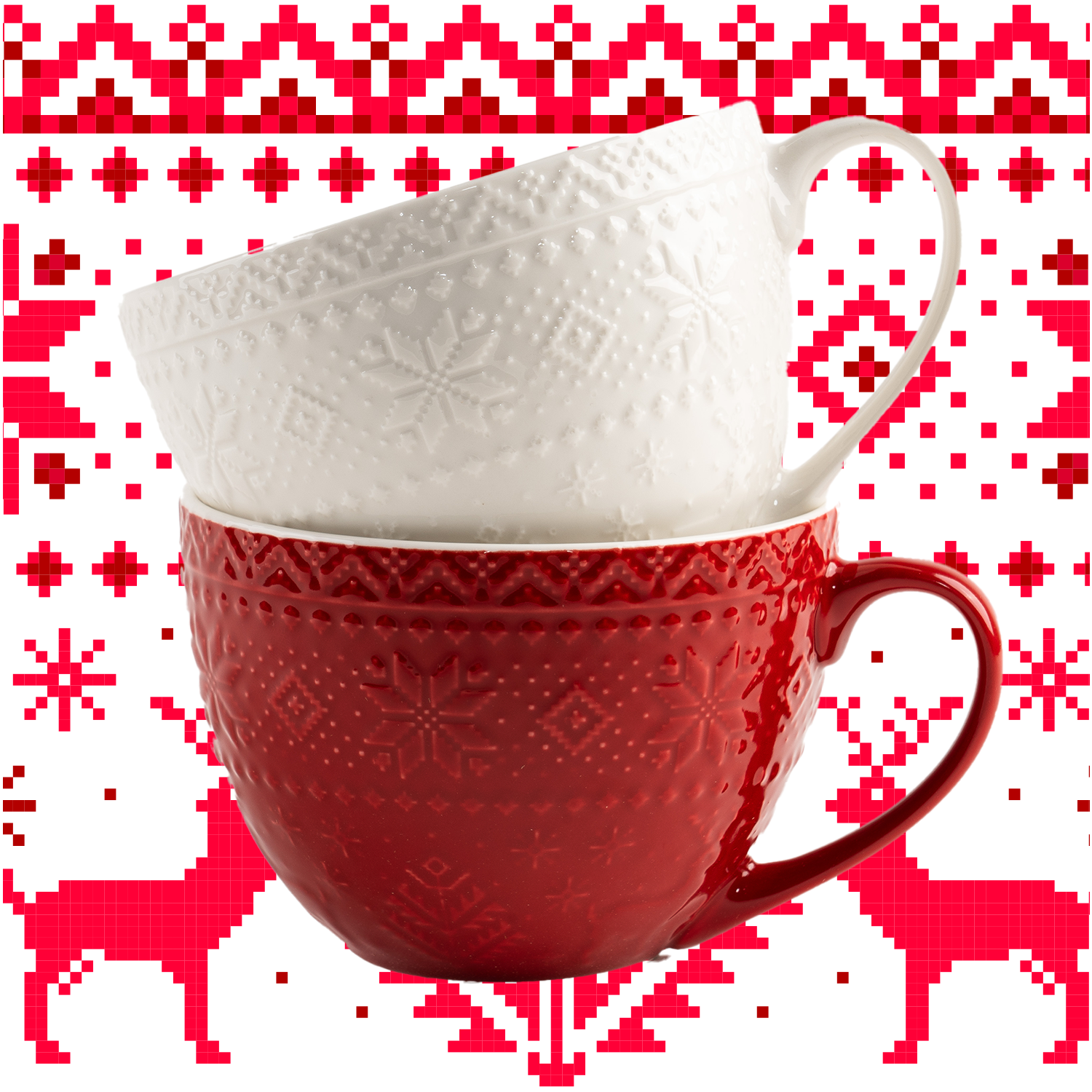 W zestawie porcelanowych kubków znajdziesz dwa czerwone i dwa białe kubki ozdobione delikatnymi, wypukłymi świątecznymi wzorami, które dodają im elegancji i uroku. Jednak to nie wszystko!