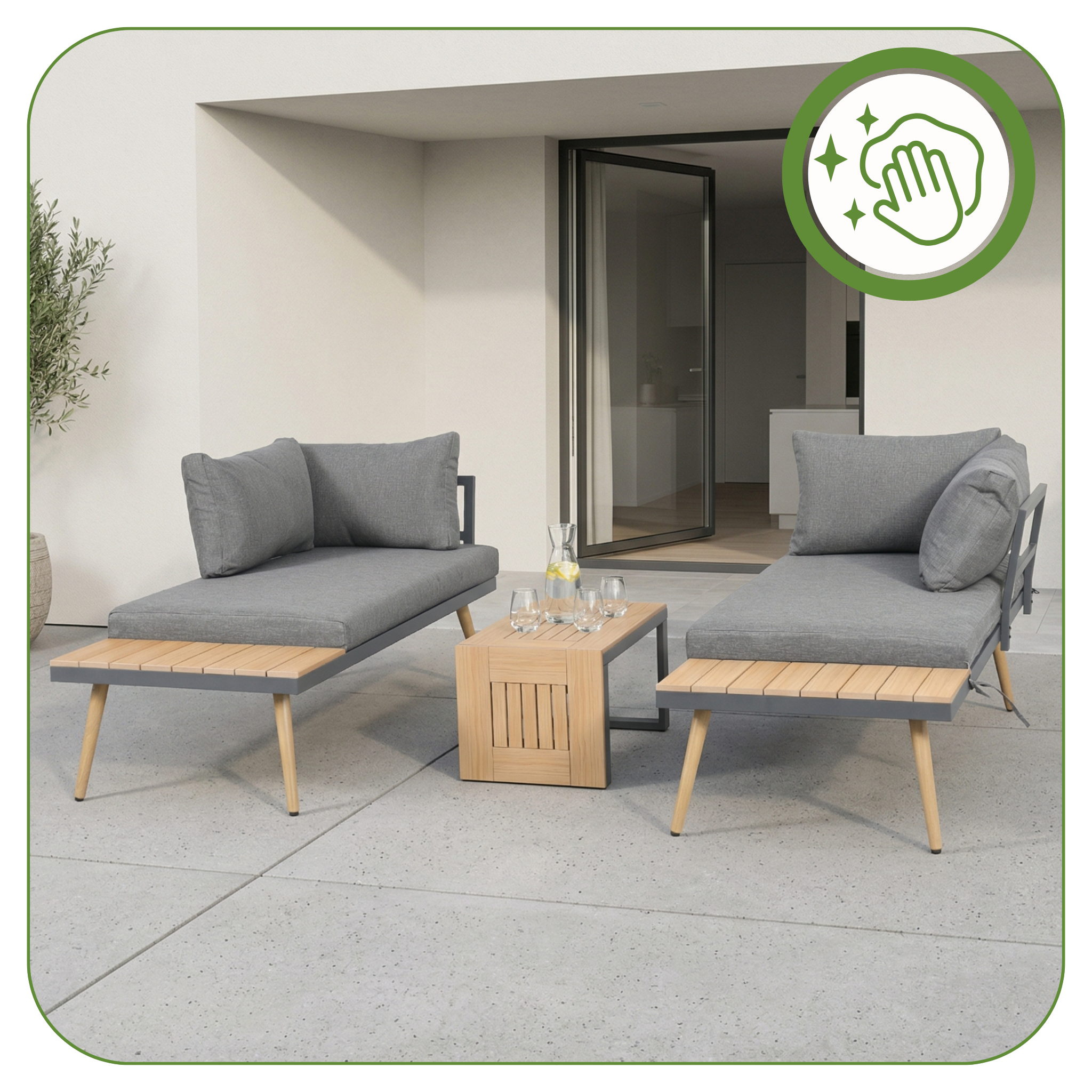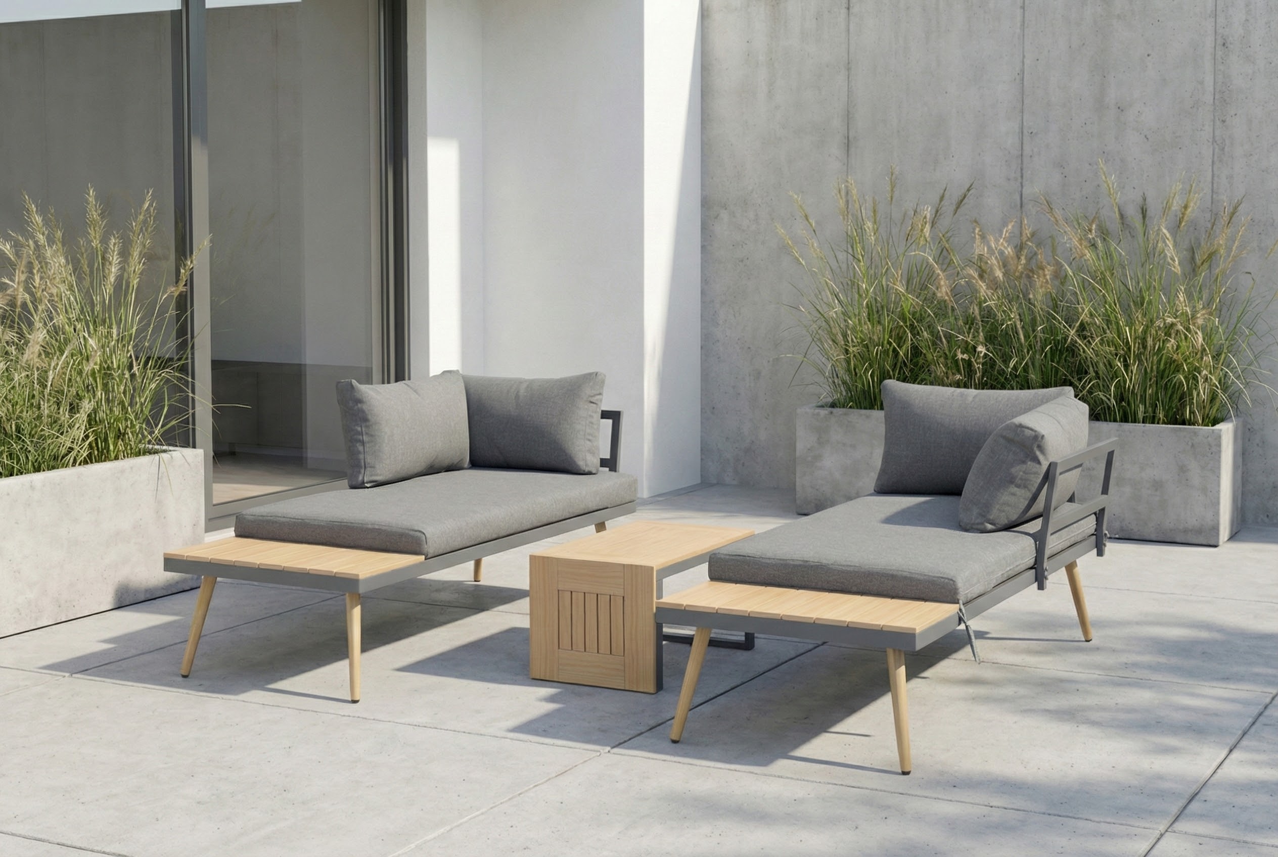 ☀️ Dwa wygodne leżaki ze stolikiem: prywatna strefa komfortu na świeżym powietrzu, gdzie każdy może rozłożyć się do opalania, zdrzemnąć lub spokojnie poczytać, nie zakłócając spokoju drugiej osoby.