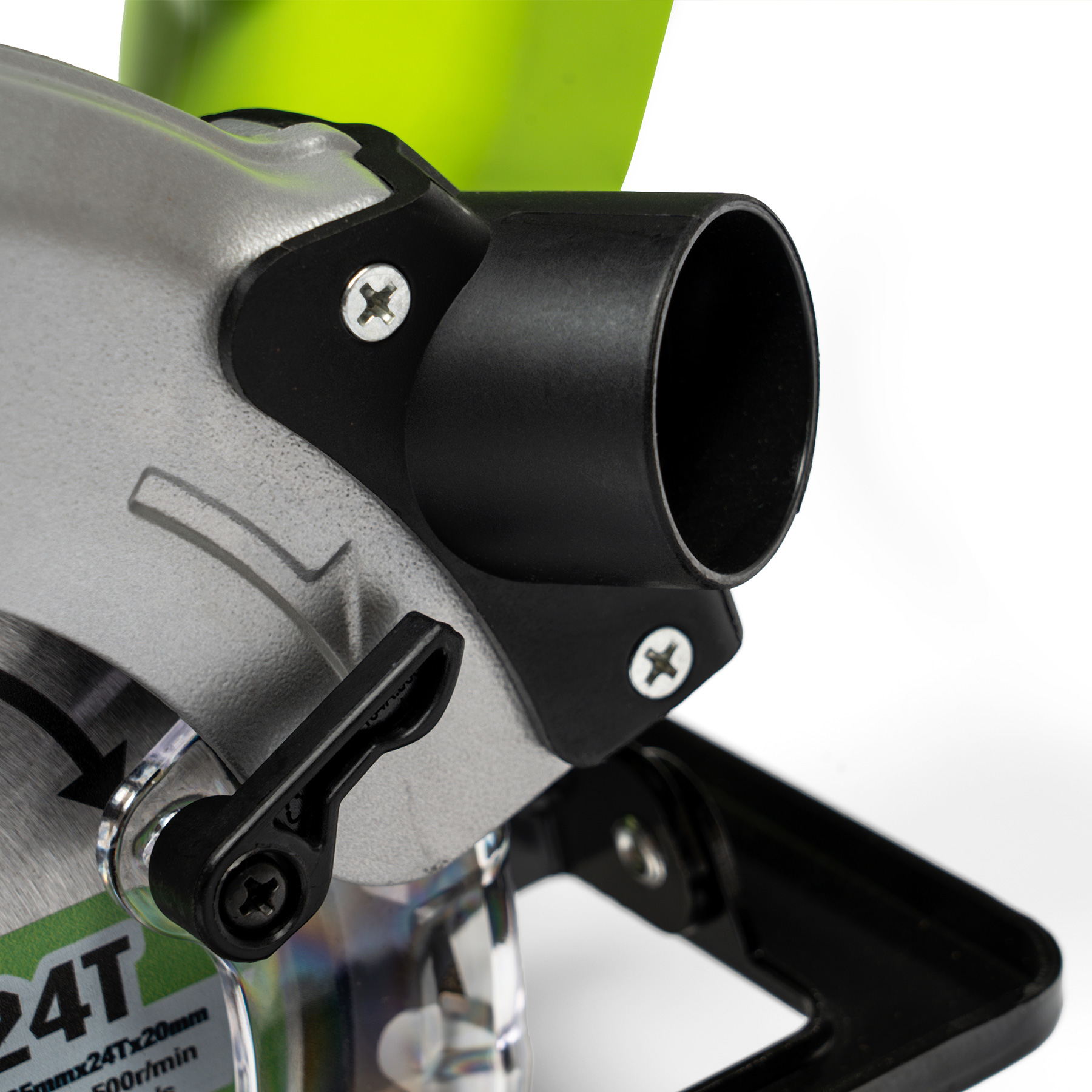 Osłona tarczy odgradza ostrze poza linią cięcia, a blokada włącznika zapobiega przypadkowemu uruchomieniu podczas przenoszenia czy regulacji.