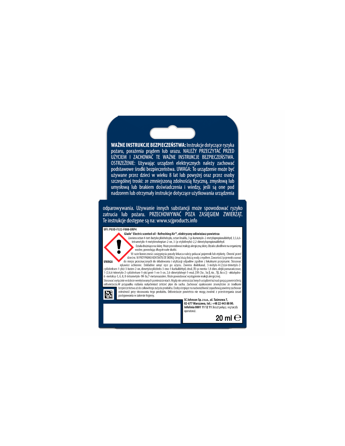 W przypadku utrzymywania się działania drażniącego na oczy: Zasięgnąć porady/ zgłosić się pod opiekę lekarza. Zawartość/pojemnik usuwać do miejsc przeznaczonych do składowania i utylizacji odpadów zgodnie z lokalnymi przepisami. Stosować rękawice ochronne. Dokładnie umyć ręce po użyciu. Zawiera alkohol cynamonowy, kariofilen, cynamonian metylu, trans-heks-2-en-1-ol. Może powodować wystąpienie reakcji alergicznej. Stosować wyłącznie w dobrze wentylowanych pomieszczeniach. W przypadku rozlania natychmiast zetrzeć płyn do sucha. Nigdy nie umieszczać innych urządzeń tuż nad gorącą powierzchnią odświeżacza. Zachować opakowanie zewnętrzne ze środkami bezpieczeństwa aż do całkowitego zużycia produktu. Osoby cierpiące na nadwrażliwość zapachową powinny zachować ostrożność przy stosowaniu tego produktu. Odświeżacze powietrza nie mogą zwolnić z przestrzegania zasad postępowania w zakresie higieny.