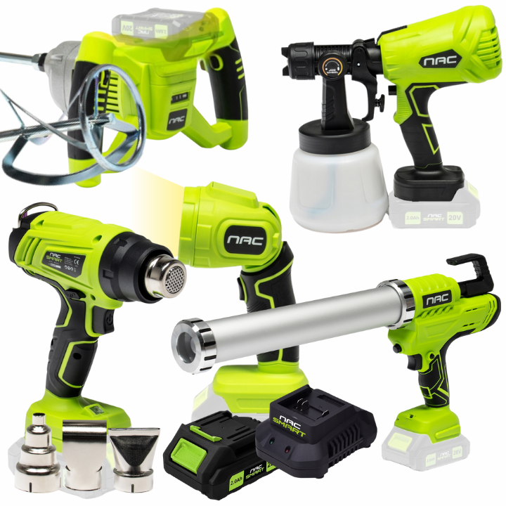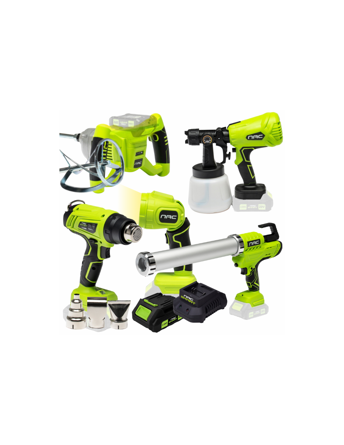 Otrzymujesz wszystko: moc do idealnego wymieszania materiału, precyzję do usunięcia starych powłok, natrysk, który daje gładką taflę, i mistrzowskie silikonowanie bez wysiłku. To kompletny system dla ambitnych, zasilany jedną baterią NAC SMART 20V.
