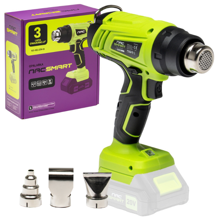 W zestawie trzy dysze do różnych zadań, a zasilanie z systemu 20V NAC SMART daje swobodę pracy tam, gdzie gniazdka brak.