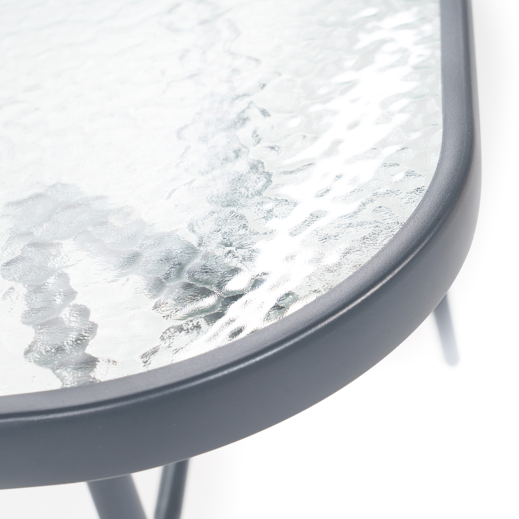 Blat stołu wykonany jest z hartowanego szkła o subtelnym, falowanym wzorze. Ten efektowny motyw nie tylko przyciąga wzrok, ale również sprytnie ukrywa drobne zabrudzenia czy rysy.