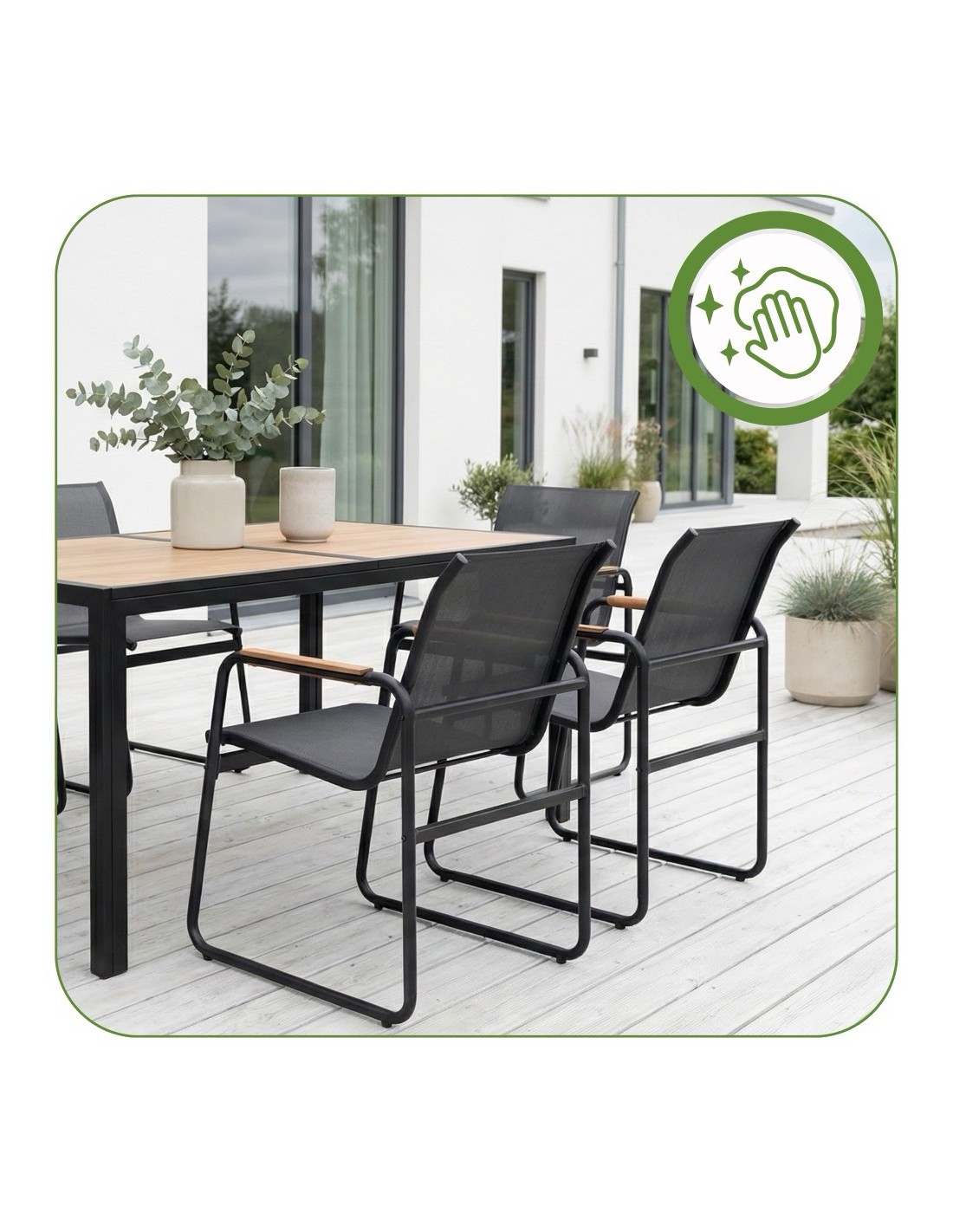 Szanujemy Twój czas. Zestaw Murcja został zaprojektowany tak, aby sprzątanie ograniczało się do minimum. Gładkie powierzchnie stali i kompozytu nie chłoną brudu. Do pełnego odświeżenia zestawu wystarczy zwykła woda z delikatnym detergentem i myjka ciśnieniowa lub wilgotna ściereczka.