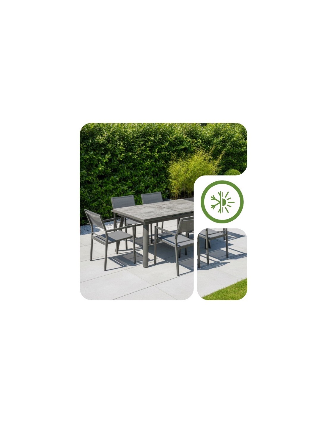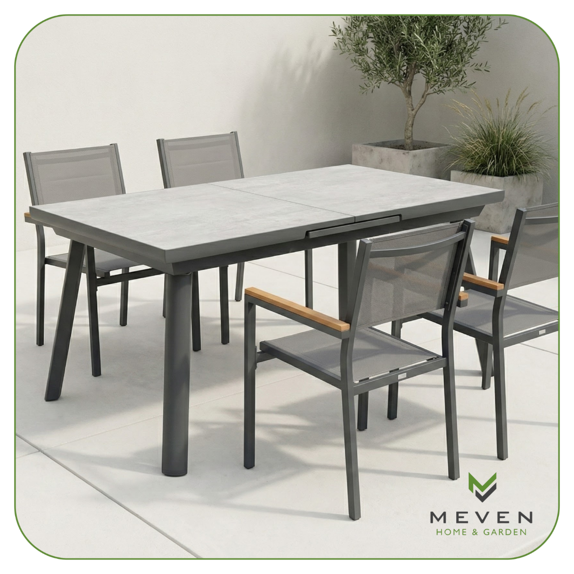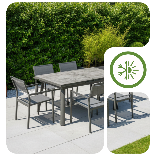 ✅ Stwórz luksusowy i spójny zestaw tarasowy, łącząc stół z dedykowanymi krzesłami Grenada lub Denia, które idealnie dopełniają jego nowoczesny design.