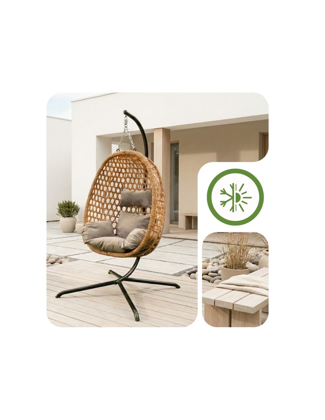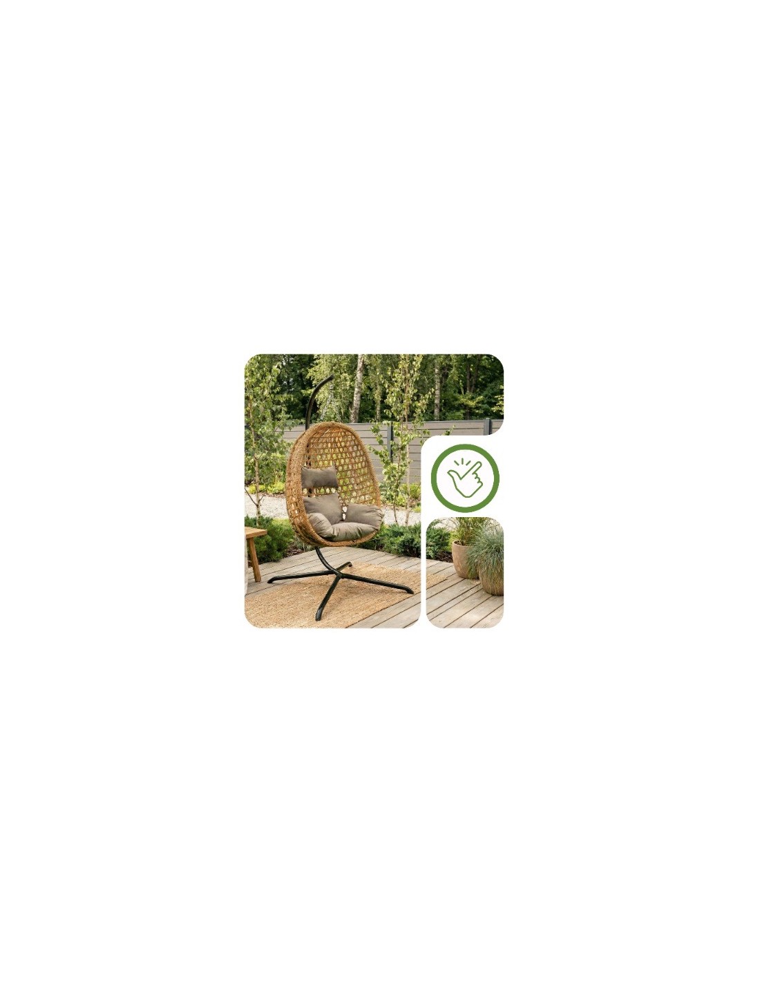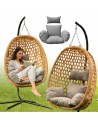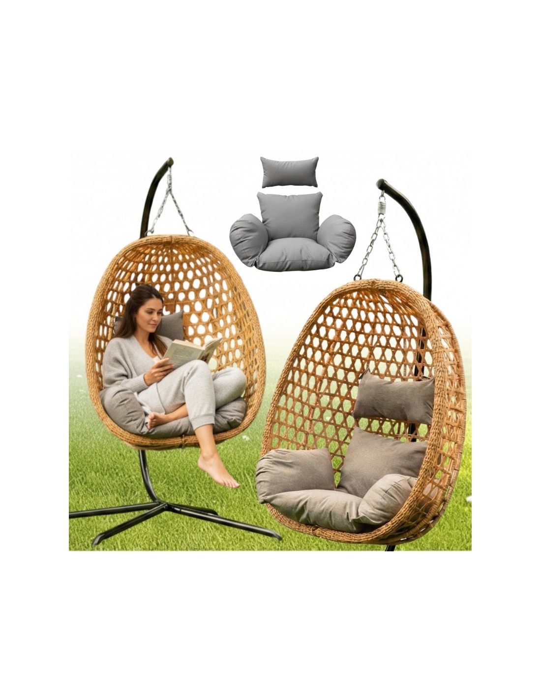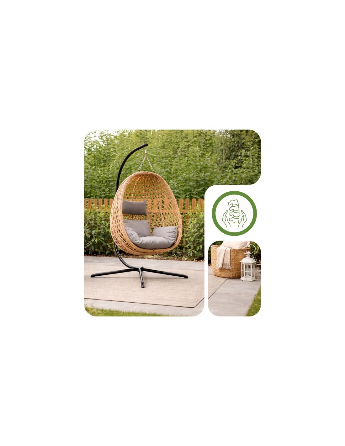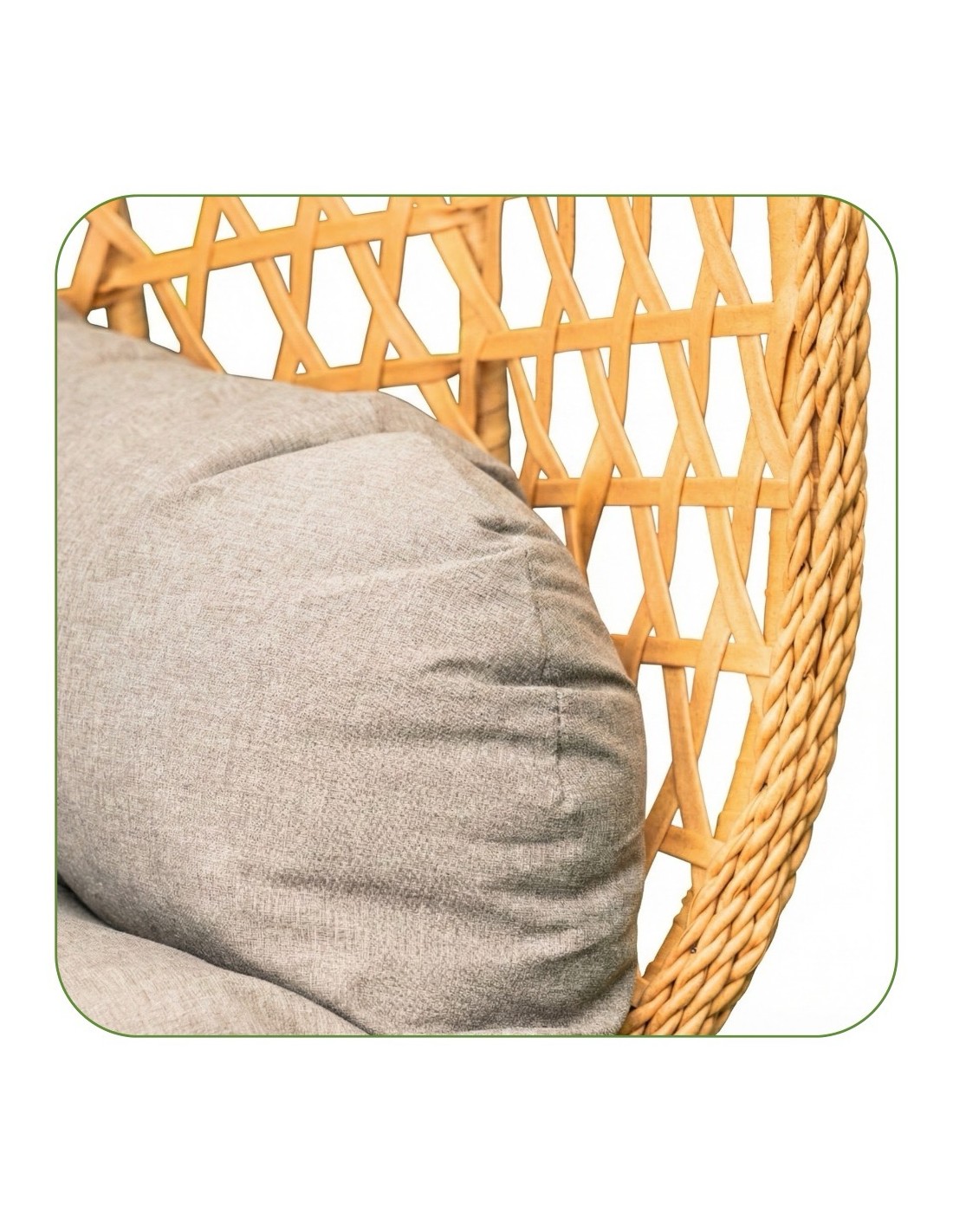 Fotel wiszący ogrodowy MEVEN AURA z technorattanu, naturalny jasnoszare poduszki