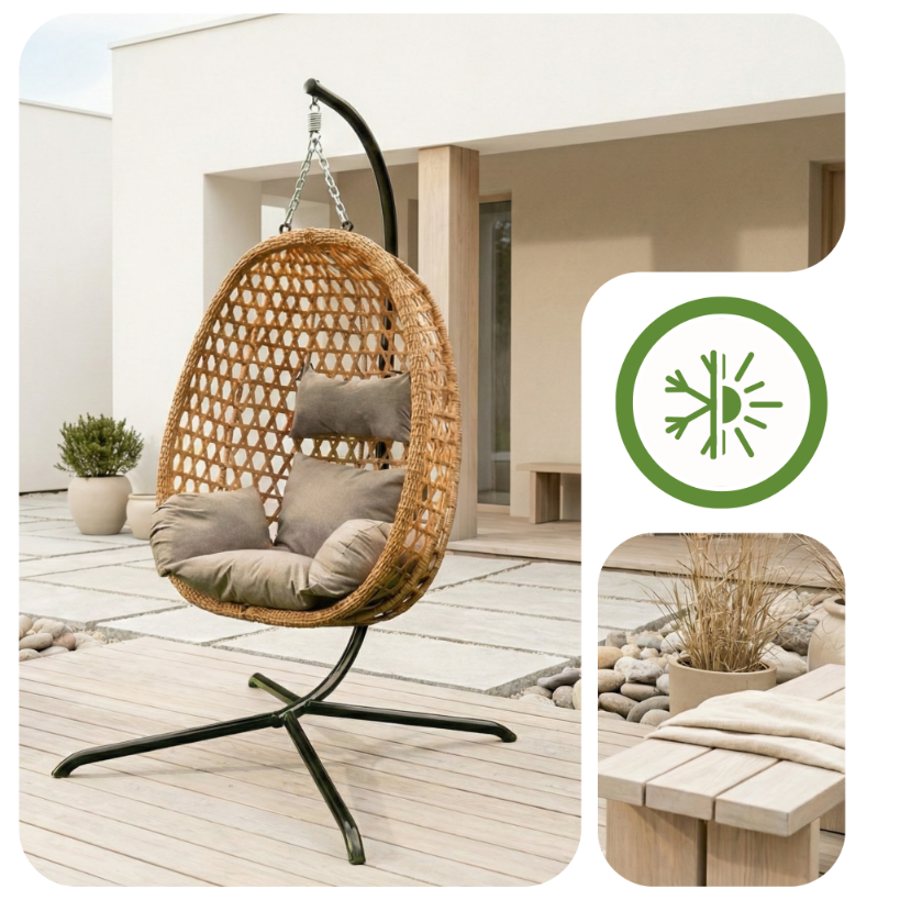 Stabilny i wolnostojący stelaż pozwala Ci na pełną swobodę bez kłopotliwego montażu na stałe. Z łatwością przeniesiesz swój ulubiony kokon z tarasu do salonu lub sypialni, dzięki czemu luksusowy komfort towarzyszy Ci przez okrągły rok, niezależnie od pogody. Zyskujesz uniwersalny mebel, który zawsze znajduje się dokładnie tam, gdzie aktualnie masz ochotę na chwilę błogiego wytchnienia.