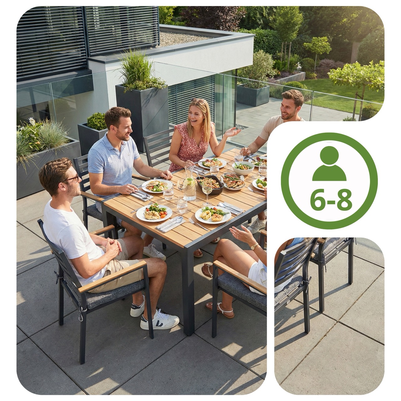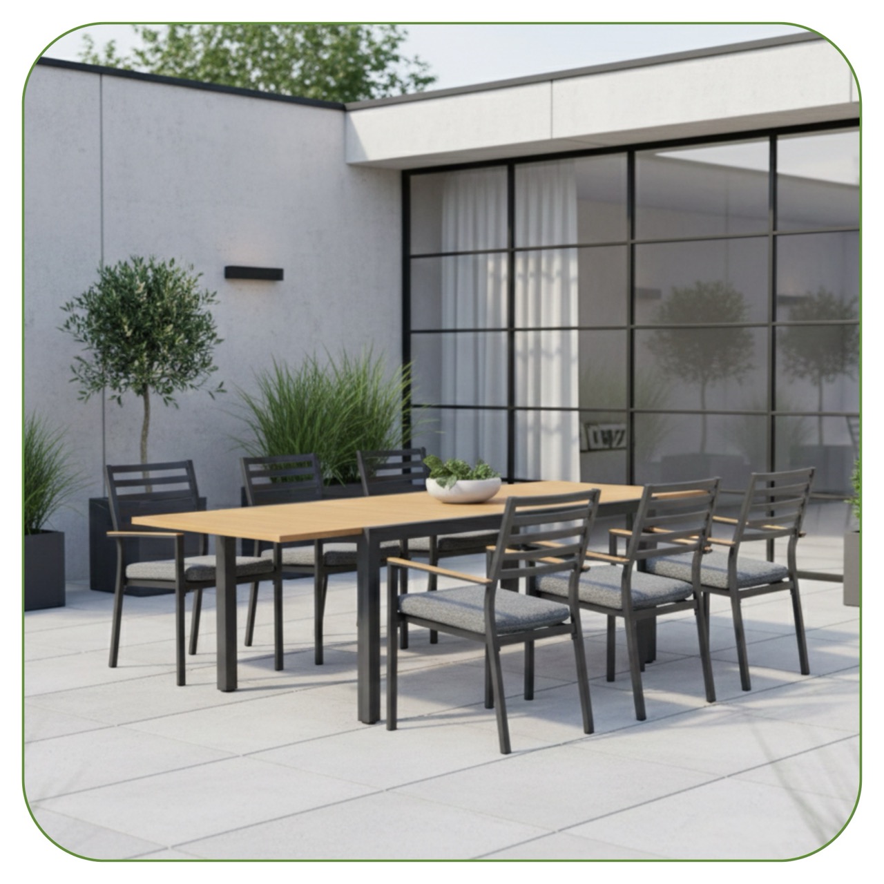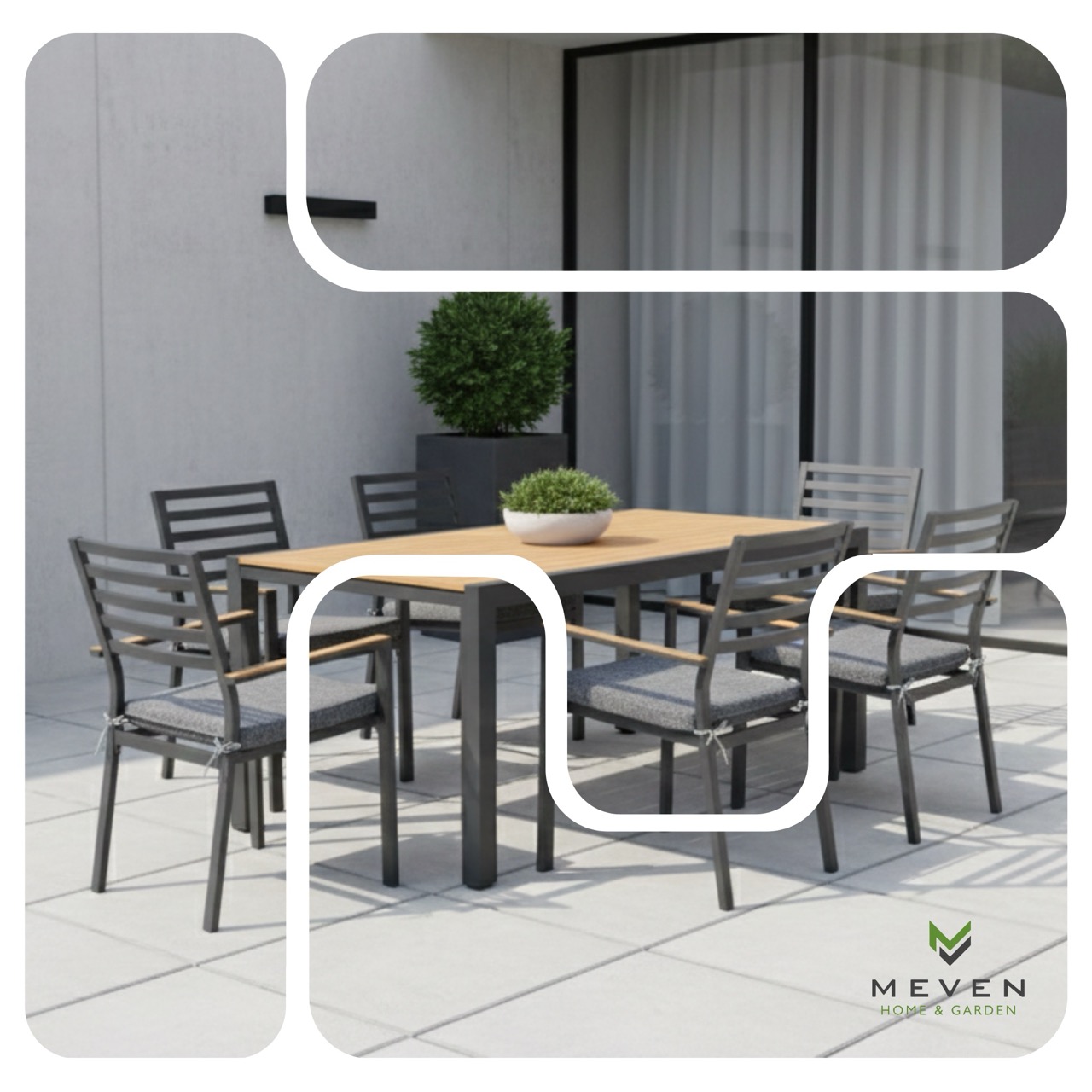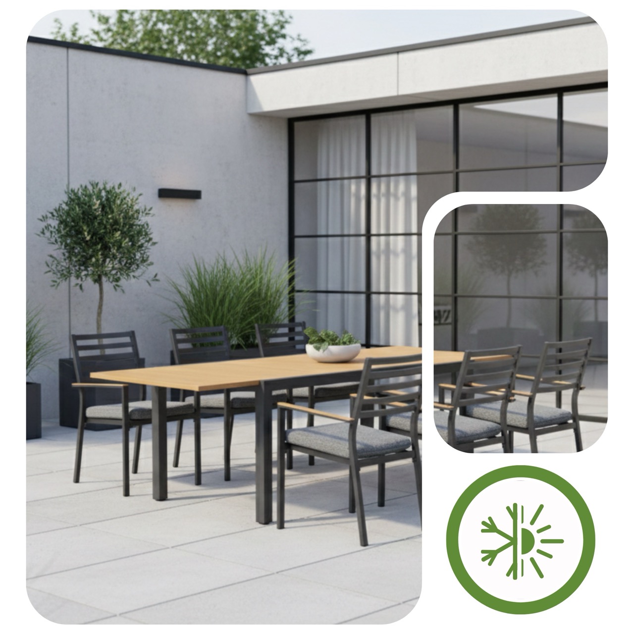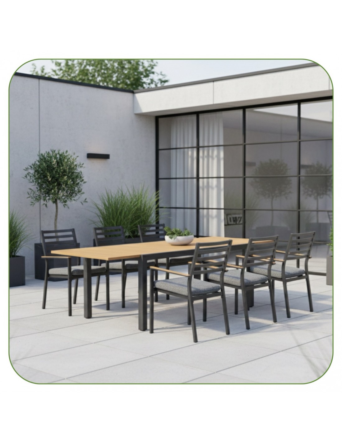 ✅ Stwórz luksusowy i spójny zestaw tarasowy, łącząc stół z dedykowanymi krzesłami Valencia lub Denia, które idealnie dopełniają jego nowoczesny design.