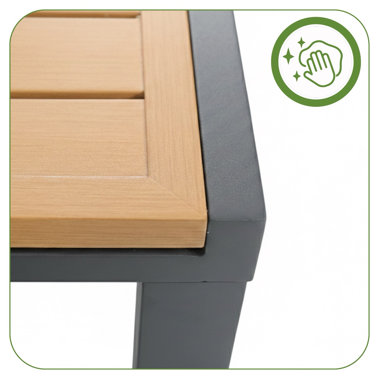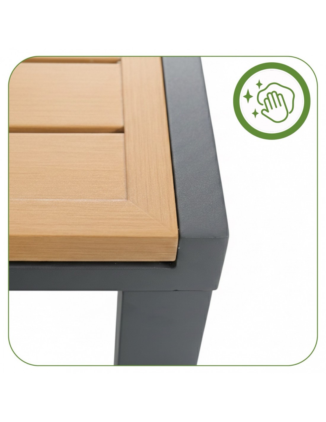 Projekt stołu opiera się na efektownym zestawieniu grafitowej, aluminiowej ramy z blatem w ciepłym odcieniu drewna.