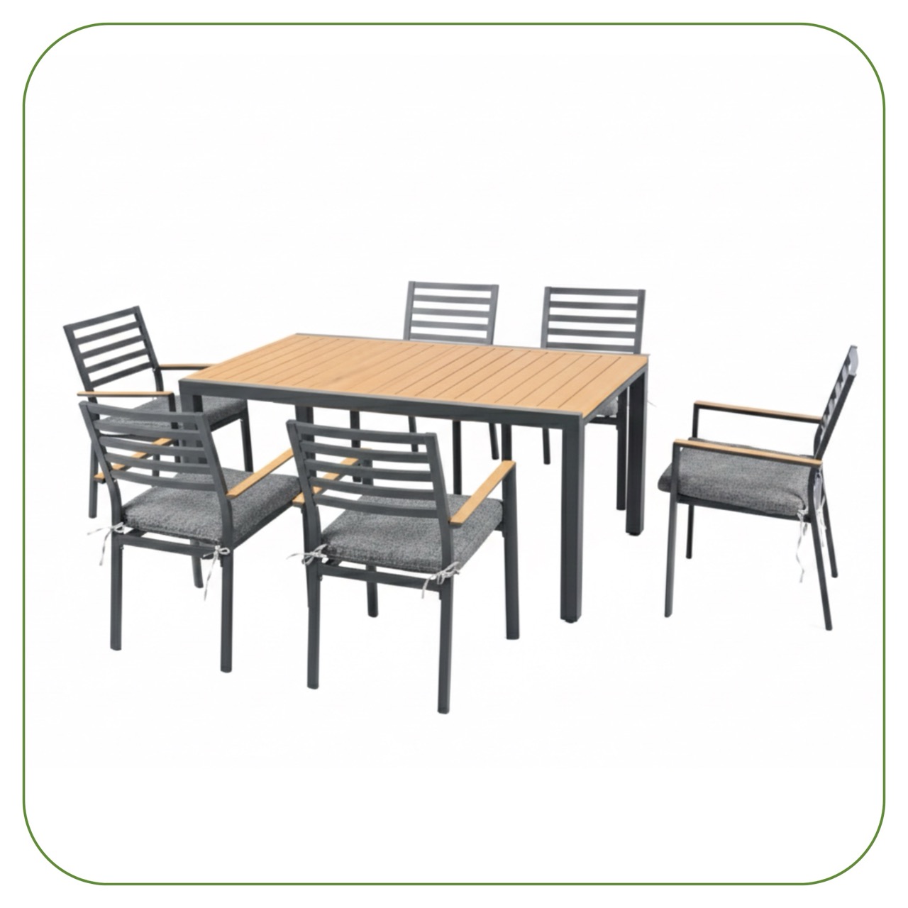 Stół został zaprojektowany jako część nowoczesnej serii mebli ogrodowych, dlatego najlepiej komponuje się z modelami Valencia lub Denia. Dzięki uniwersalnej, grafitowej kolorystyce ramy (RAL 7024), stół tworzy również spójną całość z modelem Grenada oraz większością nowoczesnych mebli tarasowych wykonanych z aluminium.