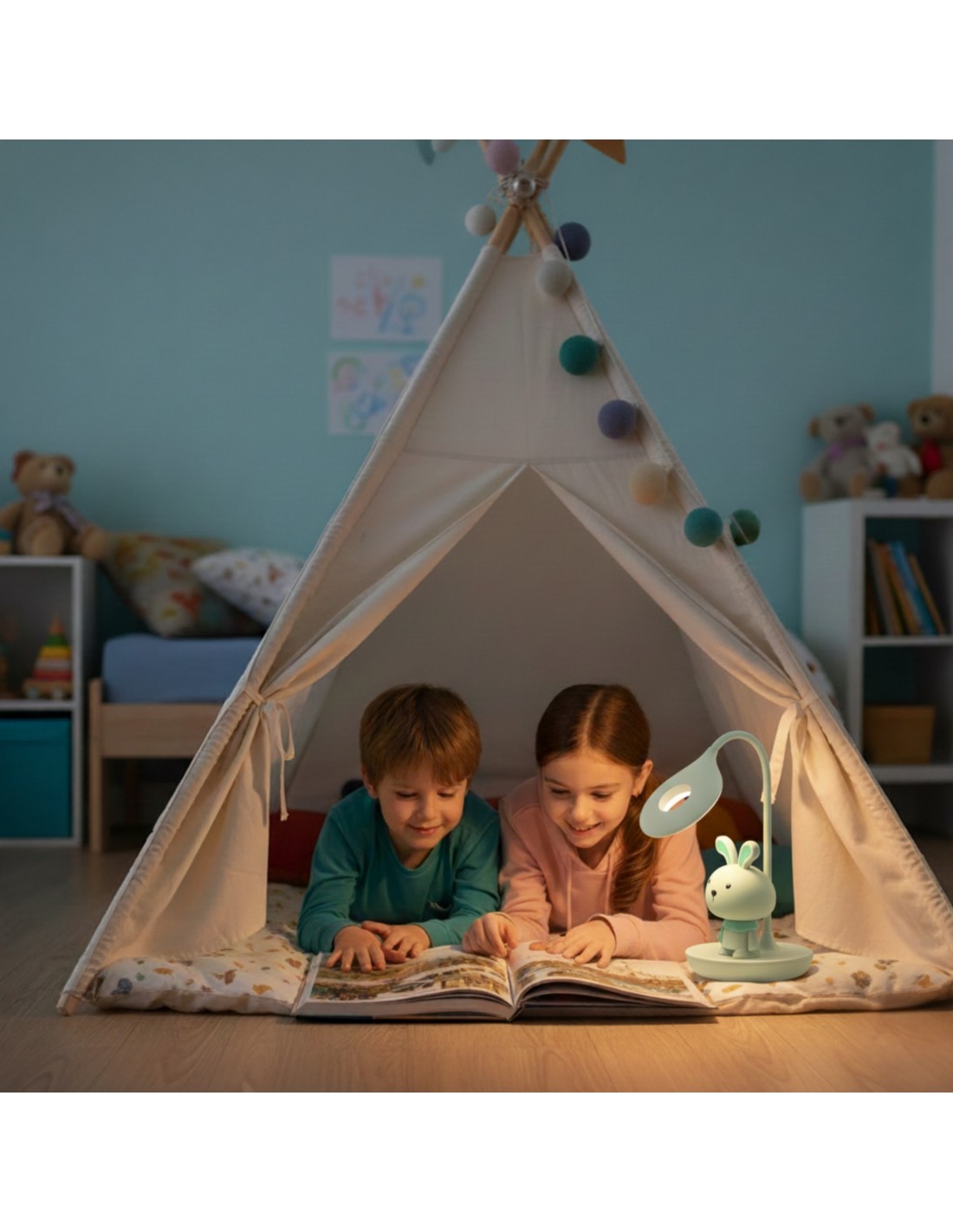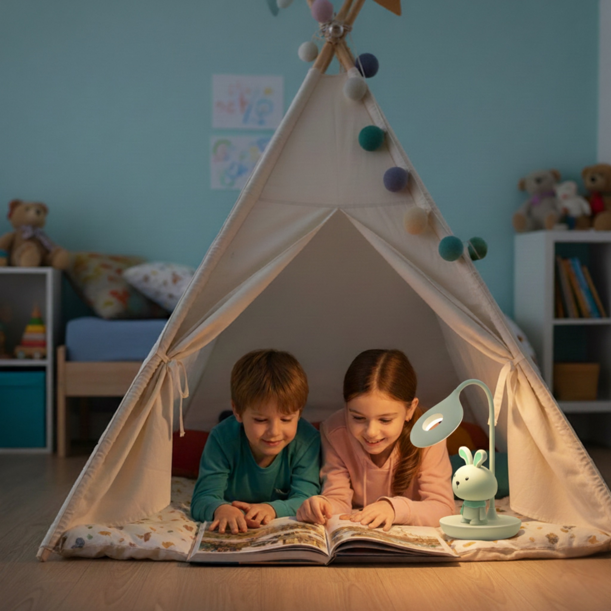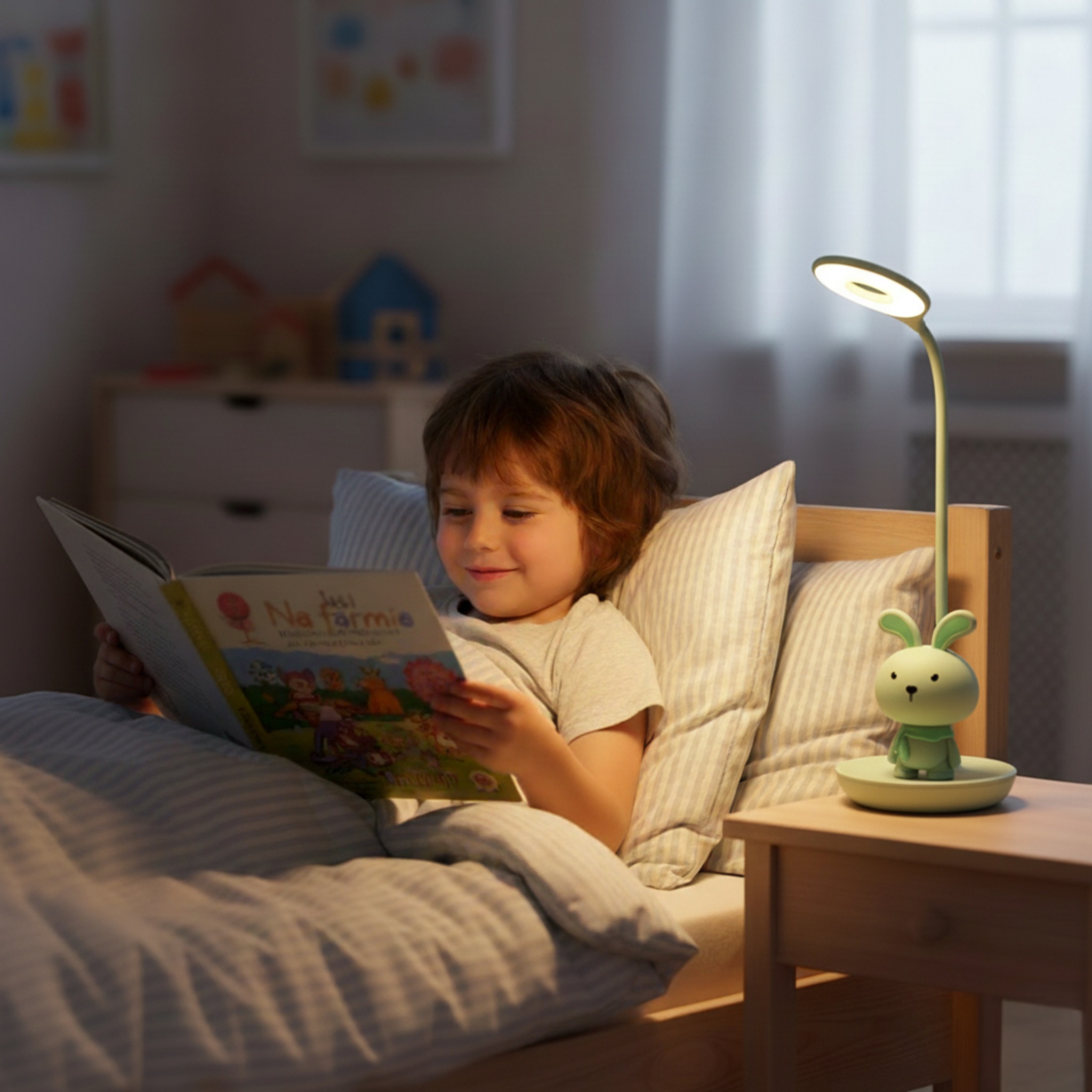 Wieczorne czytanie bajek staje się jeszcze bardziej magiczne, gdy towarzyszy mu łagodne światło przyjaznego Króliczka.