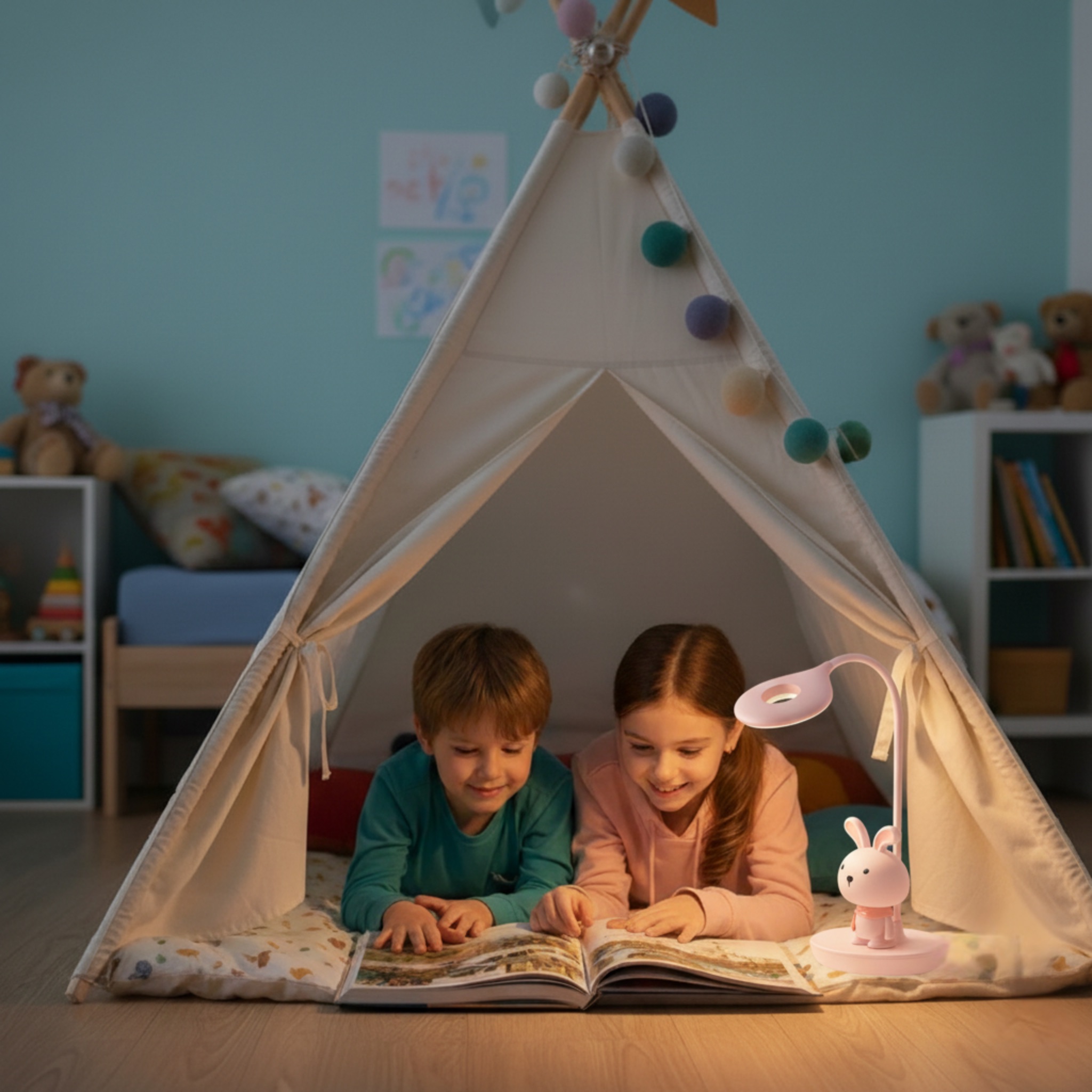 Wieczorne czytanie bajek staje się jeszcze bardziej magiczne, gdy towarzyszy mu łagodne światło przyjaznego Króliczka.