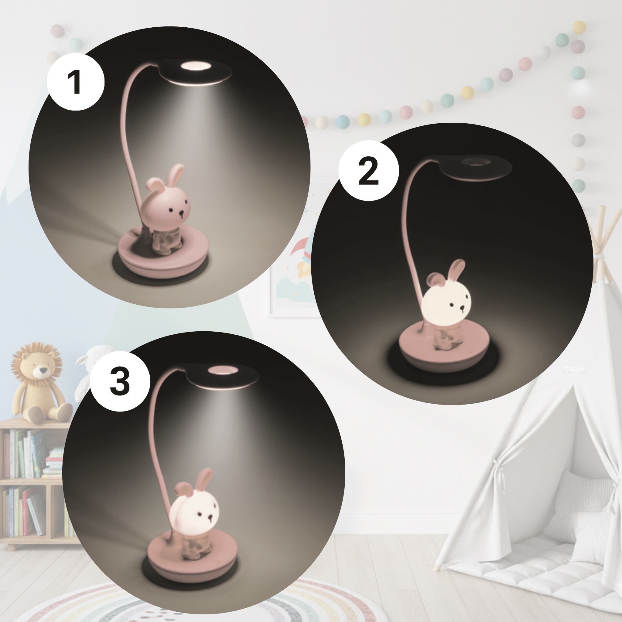 ❣️ Praktyczna funkcja 3w1 - Ty decydujesz, co świeci: tylko górny pierścień do czytania, tylko uroczy Króliczek jako lampka nocna, lub obie lampki naraz, gdy potrzebujecie więcej światła w pokoju.