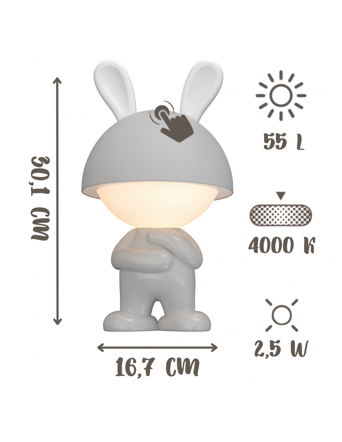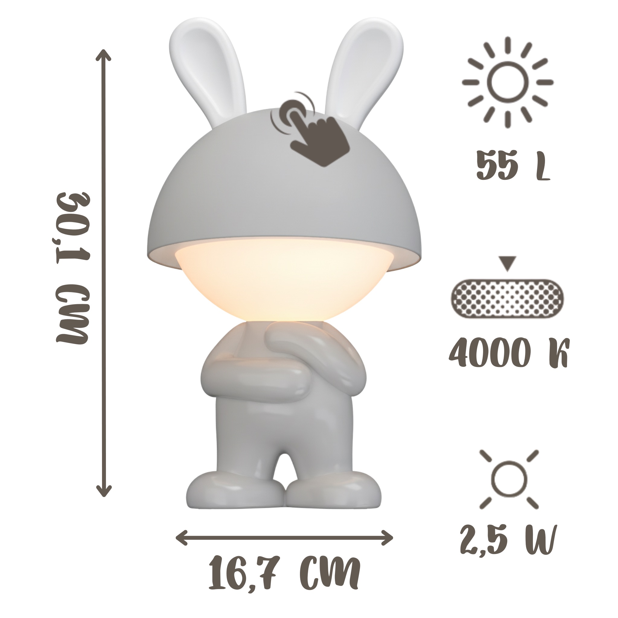 Ten uroczy króliczek to sposób na szybkie wyciszenie malucha po dniu pełnym wrażeń. Dzięki wytrzymałej obudowie lampka przetrwa każdą zabawę, a prosta obsługa dotykiem sprawi dziecku mnóstwo frajdy przy zmianie kolorów.