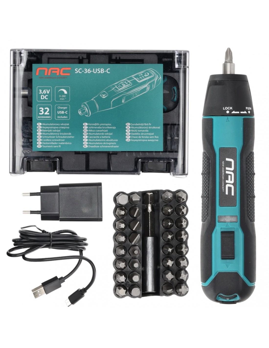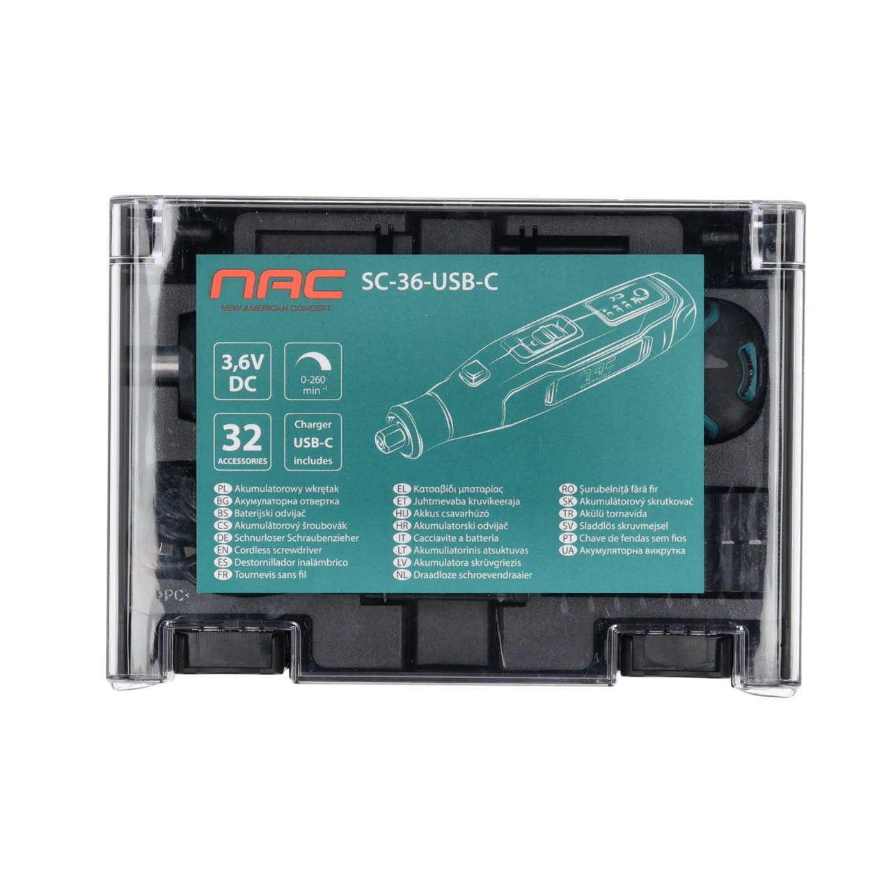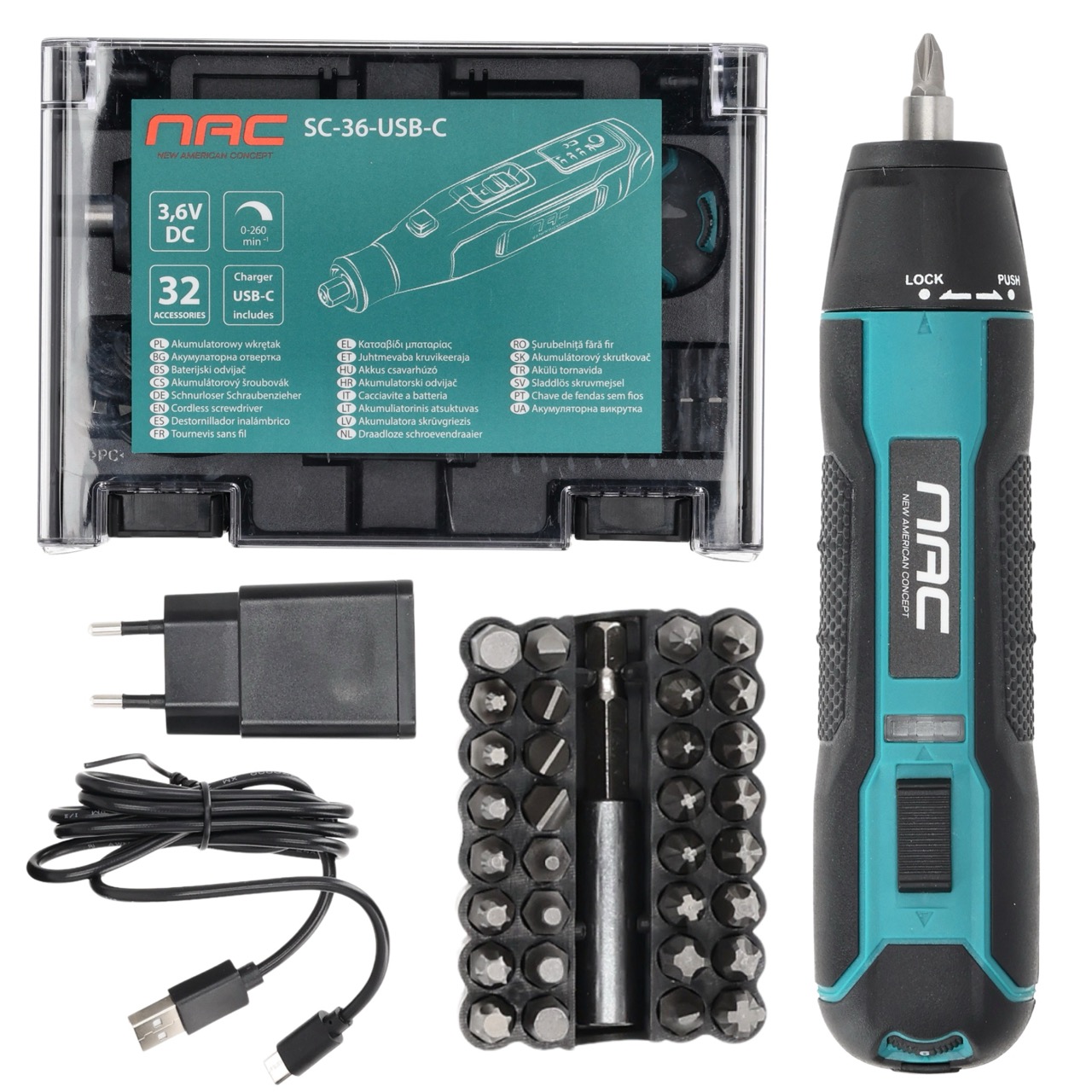 Akumulatorowy wkrętak 3,6 V z zestawem bitów i ładowaniem przez USB-C NAC SC-36-USB-C