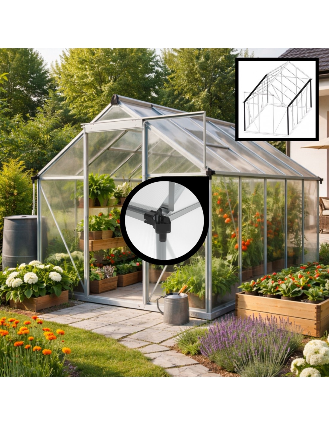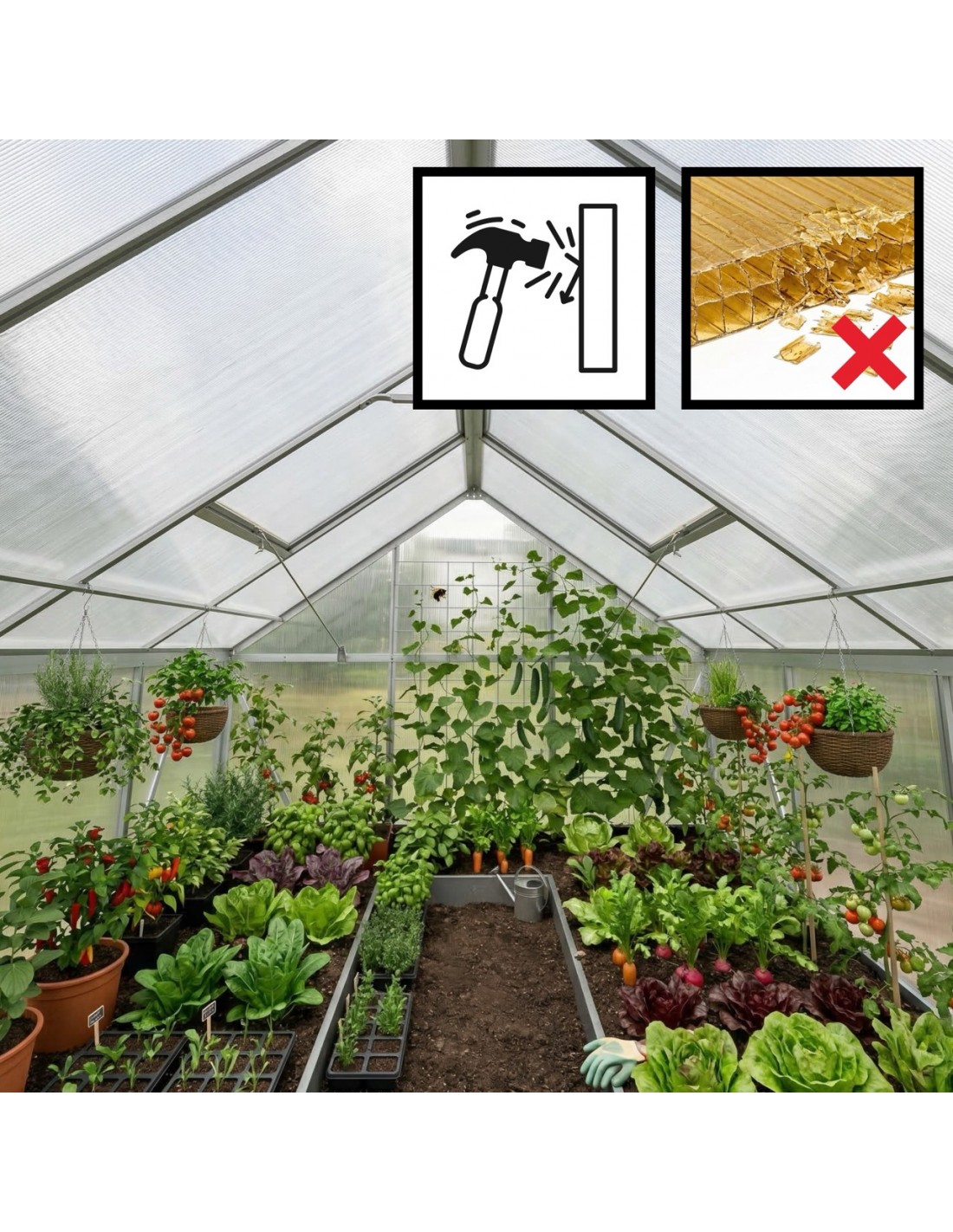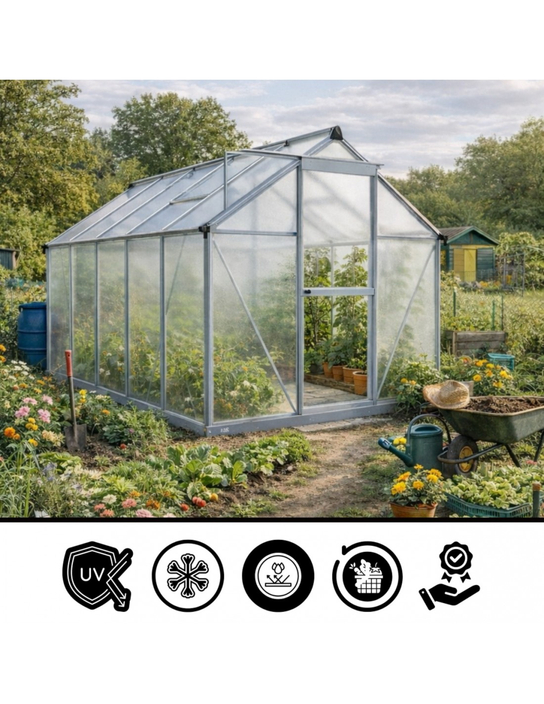 ✅ Poszycie z poliwęglanu z filtrem UV: nietłukący się materiał, który doskonale trzyma ciepło, a jednocześnie skutecznie chroni Twoje rośliny przed poparzeniami słonecznymi.
