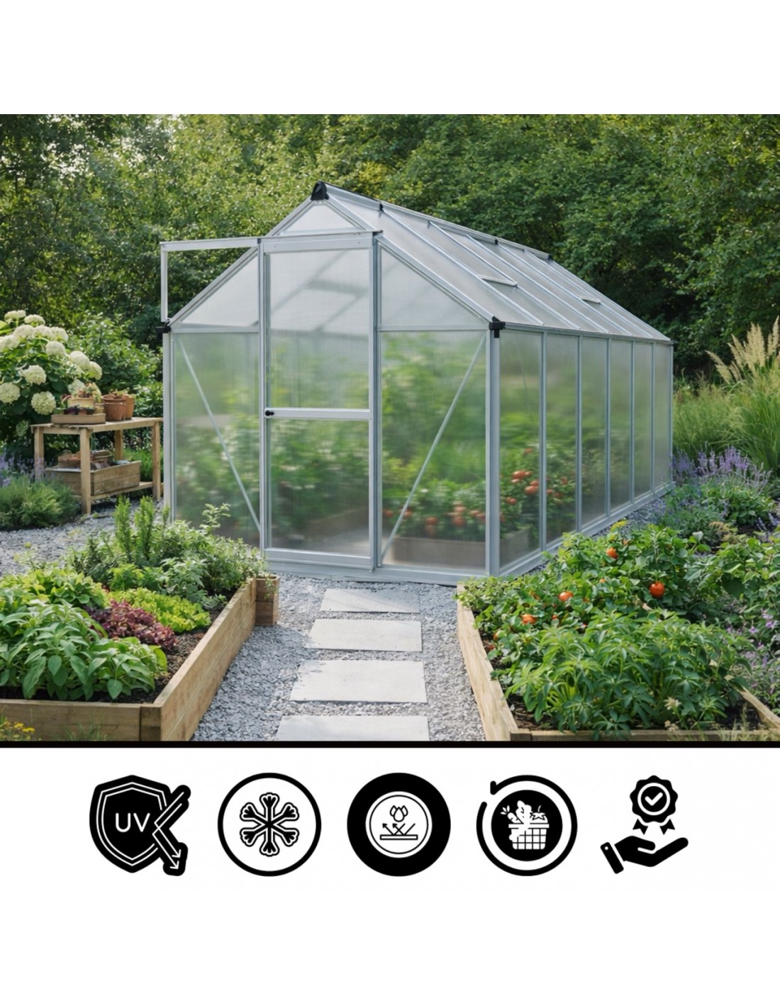 ✅ Poszycie z poliwęglanu z filtrem UV: nietłukący się materiał, który doskonale trzyma ciepło, a jednocześnie skutecznie chroni Twoje rośliny przed poparzeniami słonecznymi.